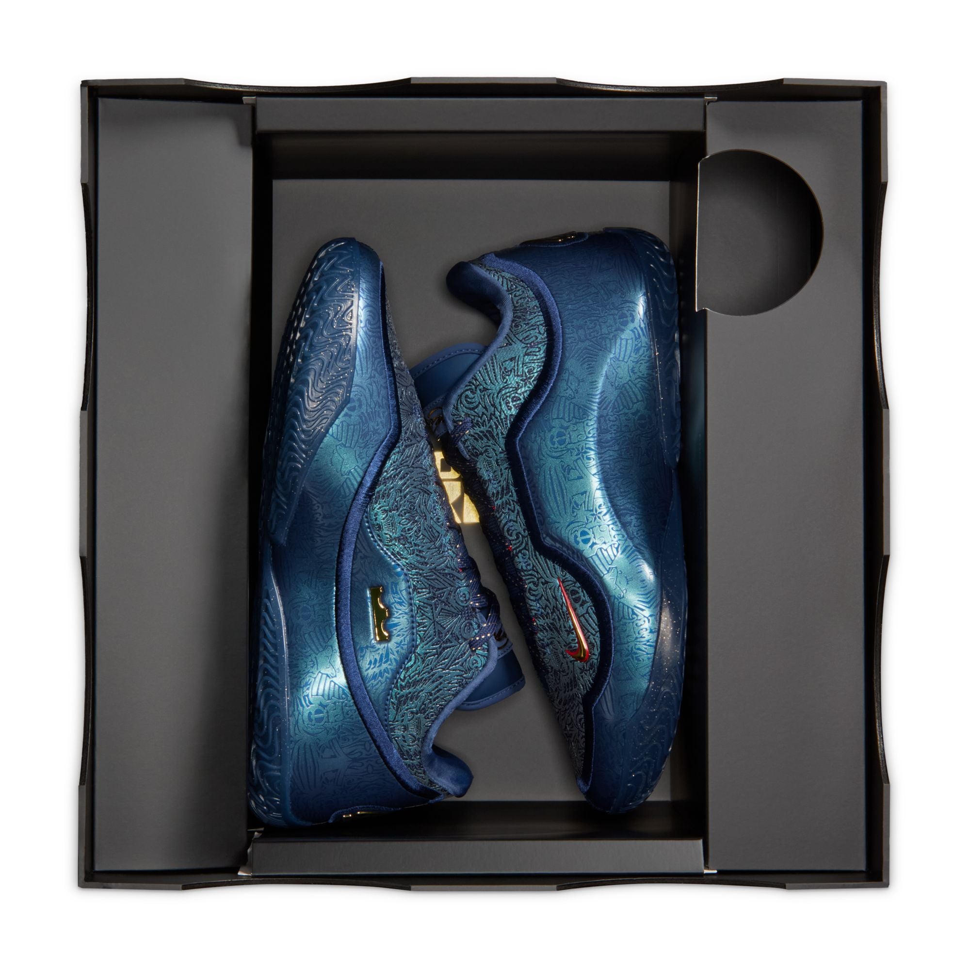 When the United States called on LeBron to exact global vengeance on the game’s biggest stage in 2008, he answered. This LeBron XXIII celebrates King James and his country. We took the same graphic pattern that covered Team USA’s on-court shoes and applied it across the upper. We wrapped it around the shoe as well, in a tone-on-tone navy material. Check out the gold fleck speckles throughout the laces and the outsole, an ode to the group that helped bring glory back stateside and restored world order in the process.